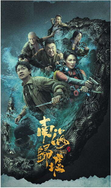 《南海归墟》中的归墟国古墓在风暴不断、海难频发的南海珊瑚螺旋海域,这里藏着秦王照骨镜,传说这面铜镜能照视人身骨骼脉络。为了找到这面镜子,胡八一、Shirley杨、王胖子等购买三叉戟号神秘船只,展开前往归墟之国的冒险旅程。跟《昆仑神宫》一样,此次旅程依旧吸引了香港古董商明叔和他的“送人头”小队,以及负责掌舵的神秘一家人,前者负责捣乱、倒戈,制造人物之间的激烈戏剧冲突,后者负责向观众引出和呈现海鬼、海怪等当地神秘鬼怪神灵,制造恐怖气氛。剧情中,“铁三角”下海后剧情逐渐吸引人,他们一路历经“阴火烧海”“吞舟之鱼”、大王乌贼、黑鳞鲛人等种种凶险际遇,神秘探险一波三折,让人屏住呼吸。该剧用特效呈现了一望无垠的开阔海景、异国风情的珊瑚庙岛、奇绝诡异的海底归墟、与巨型章鱼的精彩团战以及各种海蛇等惊骇巨兽,空间的变化为剧情奇观的塑造创造了更多元的条件,画面震撼力十足。因为水下拍摄多、特效多、画面丰富,《南海归墟》是目前为止《鬼吹灯》系列最费钱、最费时间的一部剧,这部剧展现了国产网剧“工业化体系”的制作成果,整体特效也只能说是不错。