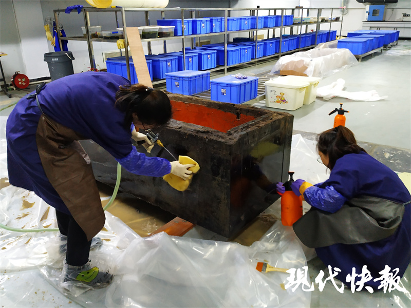 出土木漆器的修复,大多需要经过清洗、脱水加固、整形、修复、封护、验收、包装等过程,最后移交入库。脱水加固,是修复的第一步也是最关键的一步。“木漆器属于有机质类文物,在长期饱水的状态下,像豆腐一样软,并且糟朽严重,所以需要特殊的药品将其中的水分置换出来,对其加固。”王子尧告诉记者,脱水这一环节要占到至少2-3年的时间。