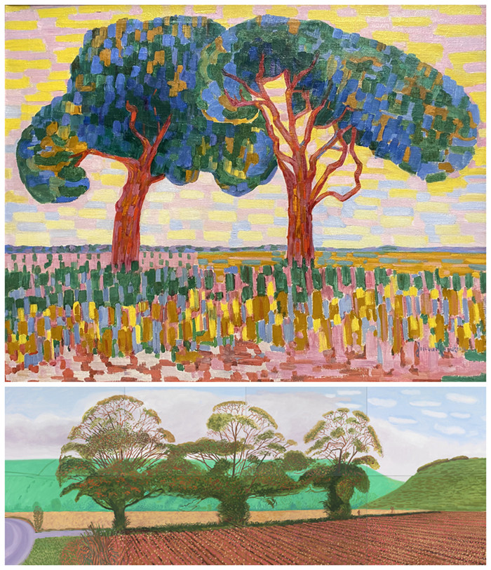 上图:《两棵树》(TwoTrees),雅格巴·凡·希姆斯凯克(JacobavanHeemskerck,1876-1923),1910,荷兰海牙美术馆藏品(KunstmuseumDenHaag);下图*:《蒂克森代尔的三棵树(秋景)》(ThreeTreesnearThixendale-Autumn),大卫·霍克尼(DavidHockney,1937年7月9日-),2007-2008,©伍尔特收藏(WürthCollection/SammlungWürth)