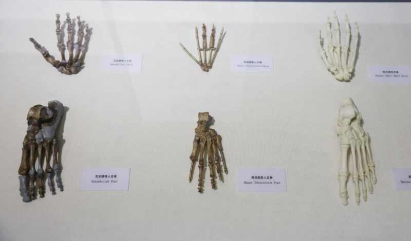 展出的尼安德特人手足骨、佛洛里斯人手足骨、现代人手足骨。新京报记者浦峰摄
