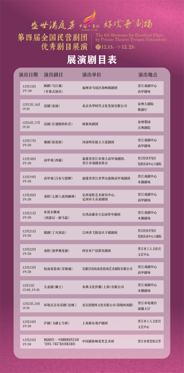 名剧荟萃,好戏连台,精彩纷呈……第四届全国民营剧团优秀剧目展演持续到25日,展演剧目涵盖8个戏曲剧种,规模较大,作品具有广泛性、代表性,为广大市民朋友带来一场场戏剧盛宴和文化享受。市民朋友们可通过“晋江演艺网”“泉州梨园古典剧院”“泉州大剧院”等平台进行购票。