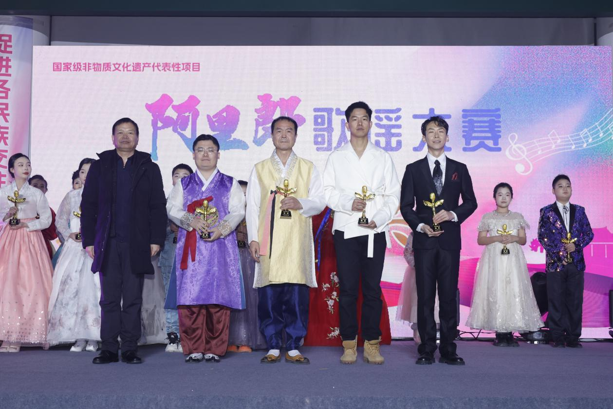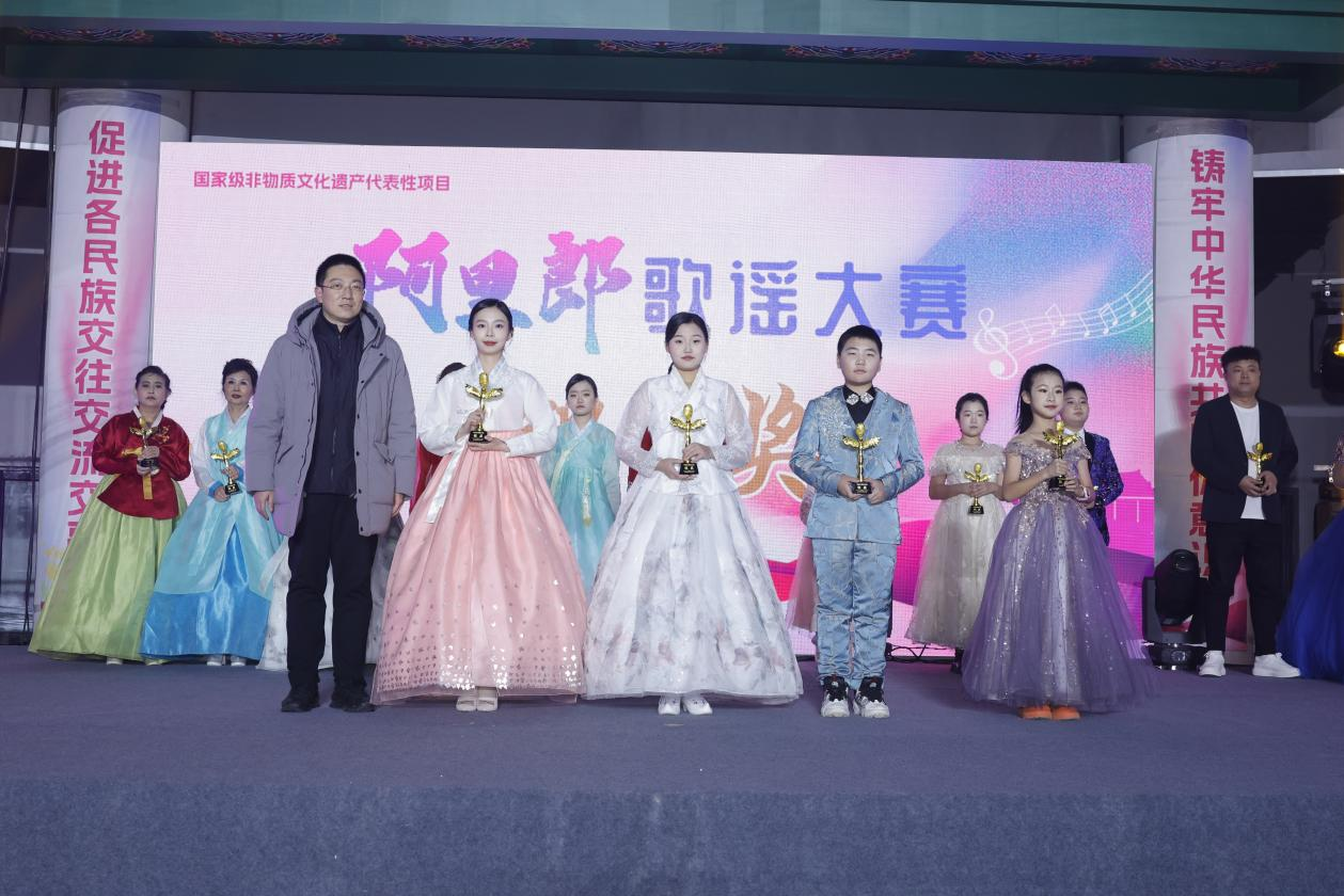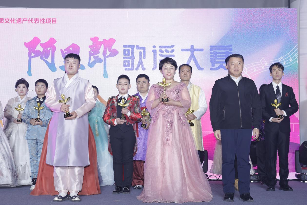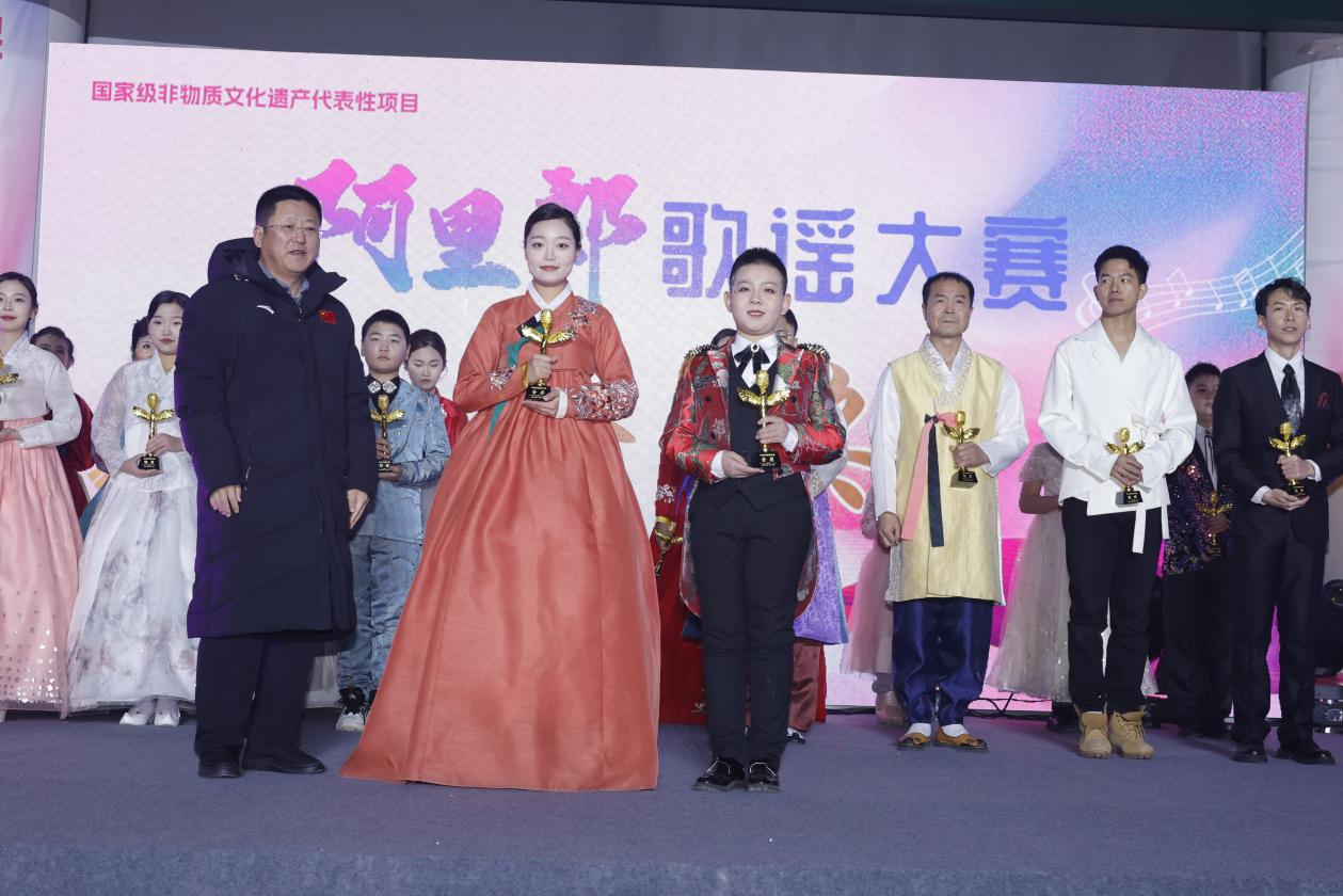 伴随着卞英花嘹亮动听的歌声,“国家级非物质文化遗产代表性项目‘阿里郎’歌谣大赛”的奖项一一揭晓:严裕敬获得了“阿里郎民谣”青少年组金奖,金青林获得了“阿里郎民谣”成年组金奖,宗益丞获得了“大众歌曲”青少年组金奖,赵丽辉获得了“大众歌曲”成年组金奖;崔智慧、沈慧珍获得了“阿里郎民谣”青少年组银奖、李哲范、梁珉浩获得了“阿里郎民谣”成年组银奖,原畅、秦宇晨获得了“大众歌曲”青少年组银奖,孙永胜、张乃轩获得了“大众歌曲”成年组金奖银奖;孙知延、金郁珍、金佳贤获得了“阿里郎民谣”青少年组铜奖;姜英淑、合唱四人组(姜明玉、朴贞善、金英姬、康姬莲)、崔锦花获得了“阿里郎民谣”成年组铜奖;孟洵、杨舒涵、郝怡然获得了“大众歌曲”青少年组铜奖,张建强、田莹、娄雨生获得了“大众歌曲”成年组铜奖。