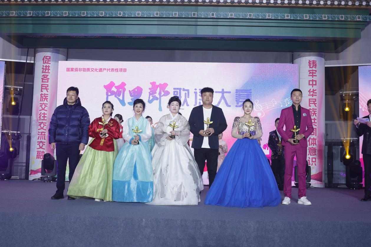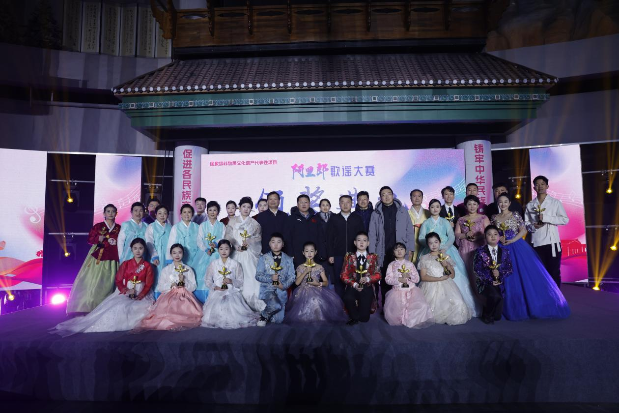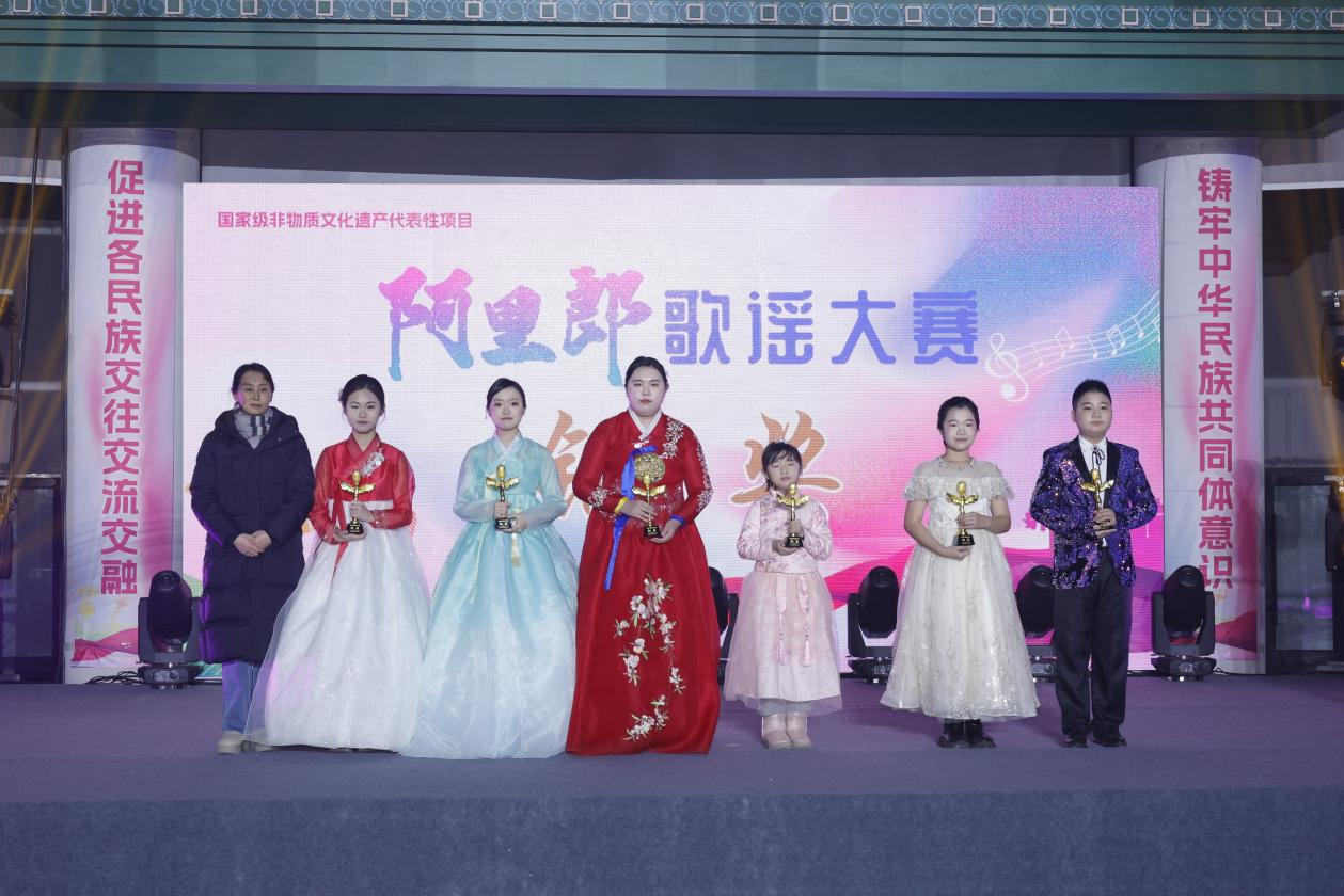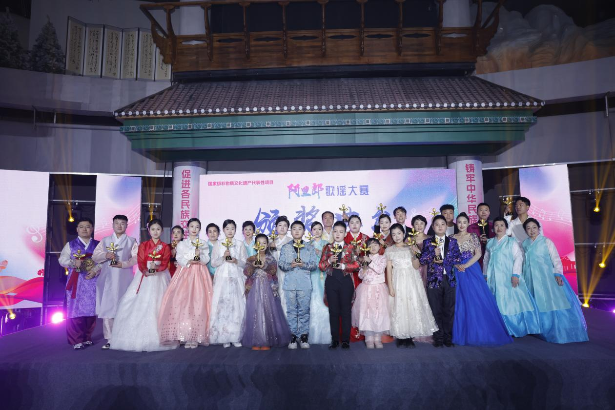 伴随着卞英花嘹亮动听的歌声,“国家级非物质文化遗产代表性项目‘阿里郎’歌谣大赛”的奖项一一揭晓:严裕敬获得了“阿里郎民谣”青少年组金奖,金青林获得了“阿里郎民谣”成年组金奖,宗益丞获得了“大众歌曲”青少年组金奖,赵丽辉获得了“大众歌曲”成年组金奖;崔智慧、沈慧珍获得了“阿里郎民谣”青少年组银奖、李哲范、梁珉浩获得了“阿里郎民谣”成年组银奖,原畅、秦宇晨获得了“大众歌曲”青少年组银奖,孙永胜、张乃轩获得了“大众歌曲”成年组金奖银奖;孙知延、金郁珍、金佳贤获得了“阿里郎民谣”青少年组铜奖;姜英淑、合唱四人组(姜明玉、朴贞善、金英姬、康姬莲)、崔锦花获得了“阿里郎民谣”成年组铜奖;孟洵、杨舒涵、郝怡然获得了“大众歌曲”青少年组铜奖,张建强、田莹、娄雨生获得了“大众歌曲”成年组铜奖。