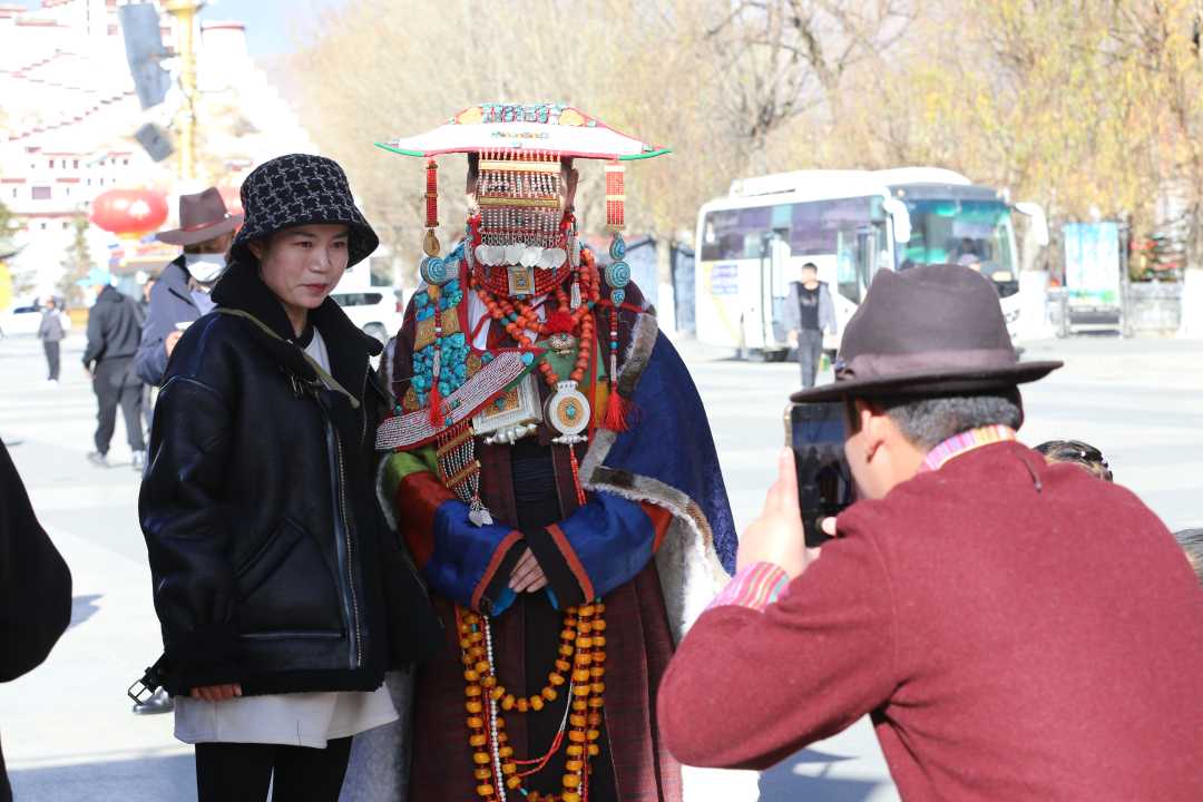 市民游客争相与身着阿里地区“孔雀服”的模特合影留念。贺建明摄