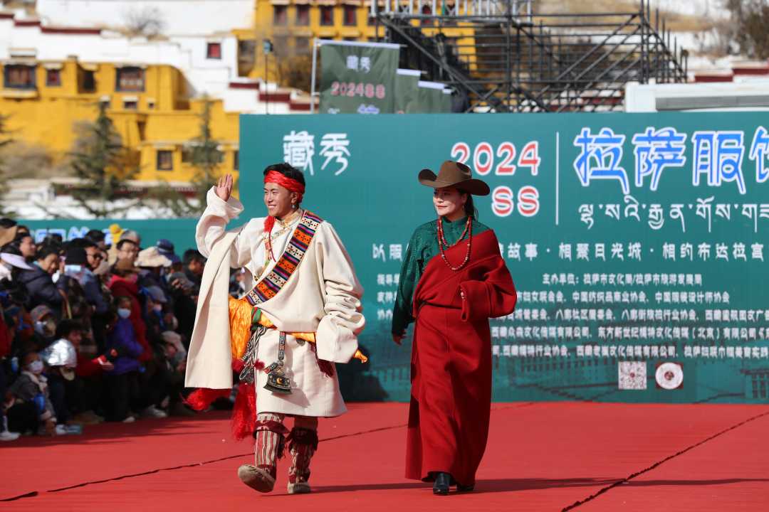 传统氆氇藏袍,锦缎面羊皮披风,色彩鲜艳的藏式围裙“邦典”,用珍珠、松石、玛瑙镶嵌而成的珠冠……12月24日,主题为“以服饰文脉,讲西藏故事”的首届“拉萨服饰周”在布达拉宫广场开幕,为市民游客呈现了一场传承与创新、时尚与民族融合的服饰视觉盛宴,为大家透过“衣冠”看西藏提供了实践。