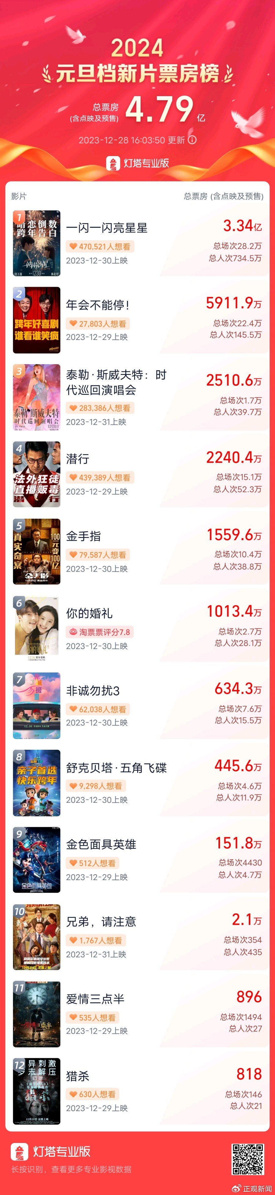 伴随着2023年的尾声,2024年元旦档(12月30日-1月1日)电影即将上映。据灯塔专业版数据,截至目前,2024元旦档票房(含点映和预售)共计4.8亿元。