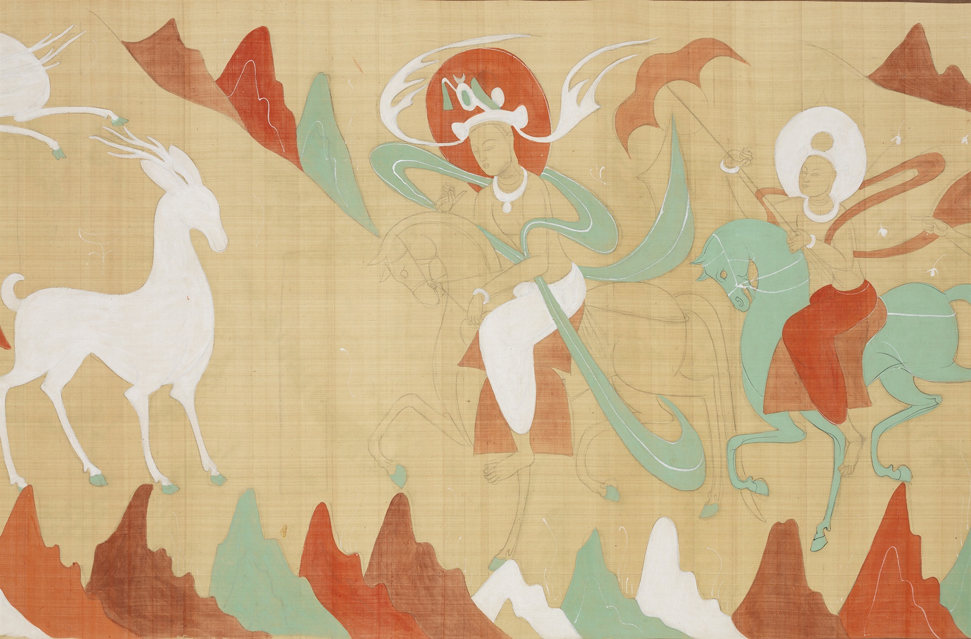 本生故事指释迦成佛前轮回、教化众生之事。此卷摹自敦煌研究院编257号窟,描绘鹿王拯救鹿群、感化国王的故事。原作是敦煌唯一的鹿王壁画,它突破情节限制,将鹿王面对国王的高潮安排在画面中央,体现壁画构图配合石窟空间的巧思。然存世已超过1500年,变色已甚,幸有此摹本可想原貌。此幅由张大千先生捐赠。