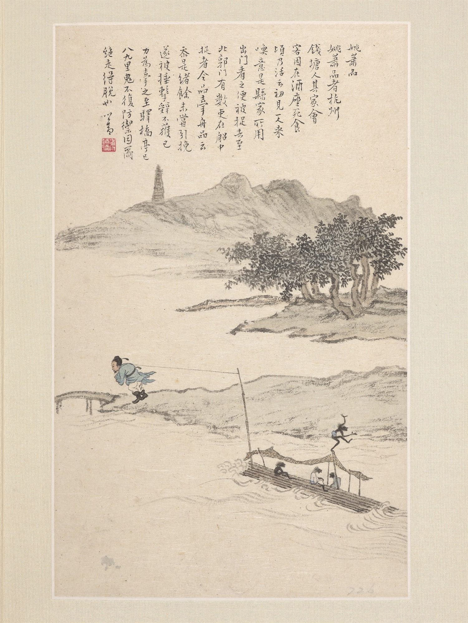 《太平广记》辑于978年,共500余则故事。溥儒此册共26开,每开一景表现一则故事,将高潮场面浓缩在极小尺幅中,用笔精丽,风格清逸。又书录原文于上,书法潇洒清峻。全册图文相辅,或奇诡、或诙谐、或讥刺、或警世,仿佛与观者谈笑书斋,深具文人气息。本次选展《烧龙》《姚萧品》《海畔石龟》《僧智通》4开。