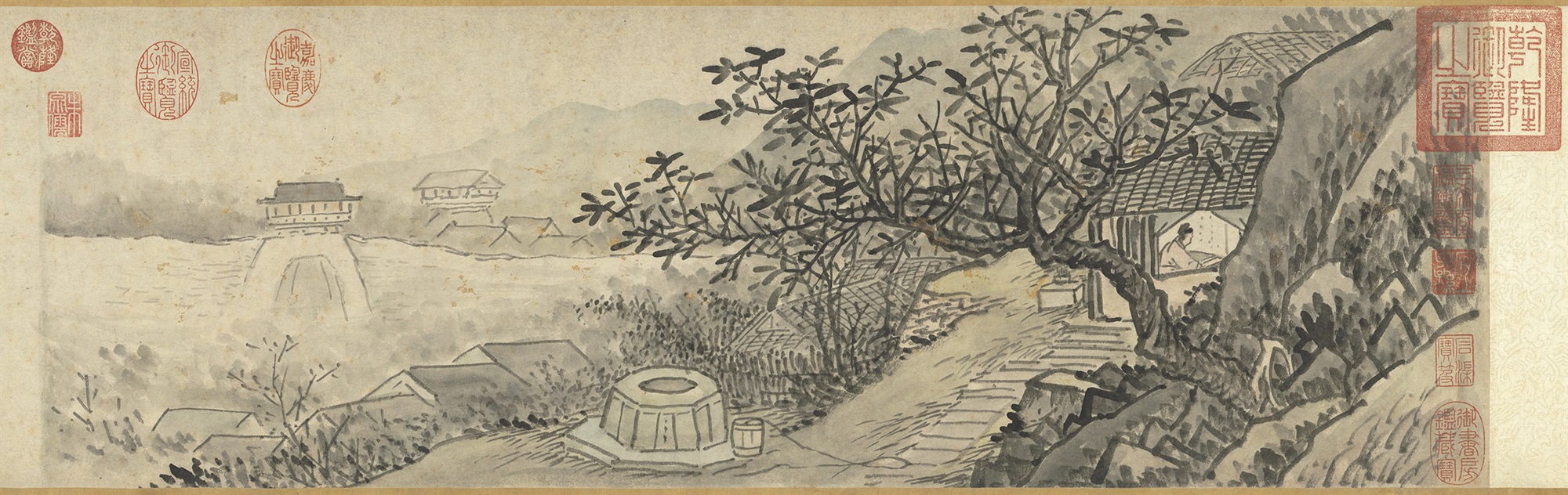 米友仁(1074—1151),米芾(1051—1107)长子,承家学,善书画,精鉴赏。本幅以群峰、山岚、云海、屋舍为母题,只画出山峰、树梢、屋顶,不画地面,表现登高望远的景观。按卷后米氏自题,应作于1135年以前。或云此卷及米题皆为摹本,与上海博物馆藏《潇湘图》有密切关系,可能反映元代云山图有送别、思亲、隐居等意涵。
