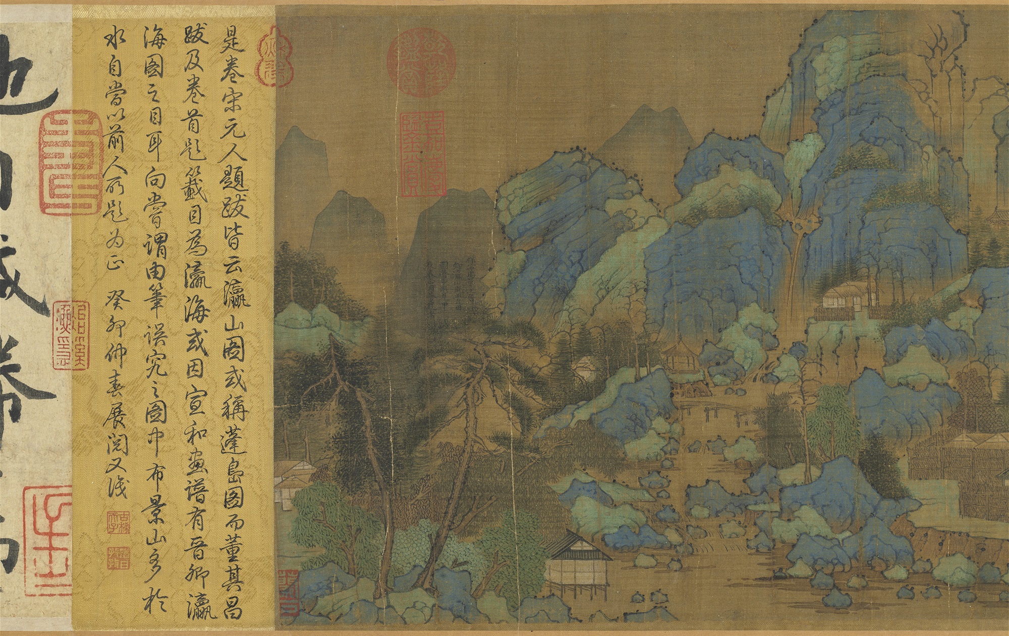 本幅左半画冈峦绝壑、山村茅茨;右半画浩渺大江、小舟点点。空旷江面与雄峻山势形成对比,构图兼得手卷与全景之趣。物象造型简洁,用笔工细。山石无皴,辅以青绿,气韵古雅又略具装饰感。款署1064年与王诜(约1048-1122)生平不符,画风也异于王诜而近钱选(1239-约1301)。跋纸“长”字半印又同院藏黄庭坚(1045—1105)《松风阁诗》,或为钱选早年为贾似道(1213-1275)临仿之作。