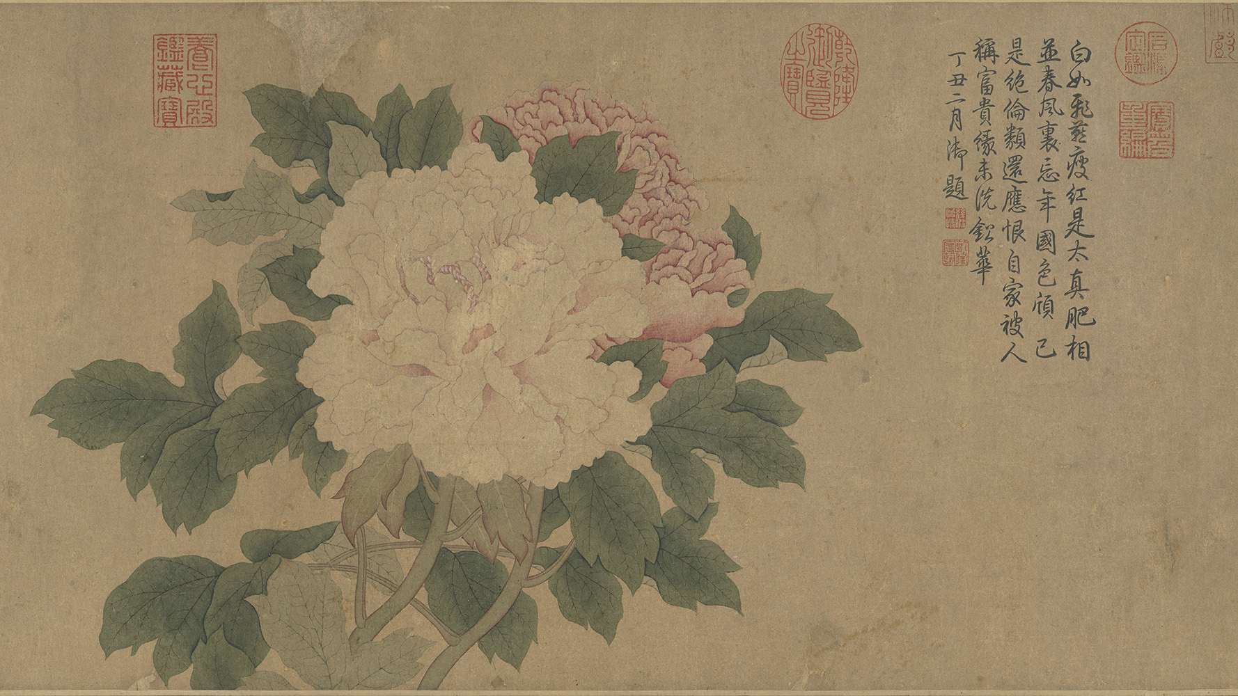 钱选(1239-约1301),浙江吴兴人。字舜举,号霅谿翁等,擅人物、花鸟、山水画,与赵孟頫等人并列“吴兴八俊”。本幅画红、白牡丹,花瓣、叶片充满细腻而曲折的轮廓,衬以网状叶脉,营造出写实、繁复的视觉效果。淡雅的颜色压抑了花朵和叶片的对比,也剥除了画面的空间感,使物象扁平化,加强了似古非古、超越现实的趣味。按其“霅谿翁”款,可知是晚年佳作。
