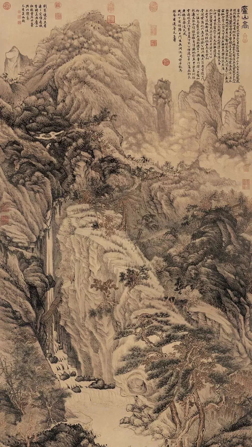 《庐山高》图,沈周借鉴元代画家王蒙的笔意,描绘庐山层峦叠嶂的景象,皴法多变而灵动厚重,笔法稳健,气势雄沉苍郁。画中山头云雾飘渺,悬崖瀑布飞泄,水流击石,树木、小草、石阶、人物等都刻画得栩栩如生。可是,作者并没去过庐山,凭借想象极力刻画庐山大气恢宏之势,来讴歌老师陈宽的学问道德令人高山仰止。