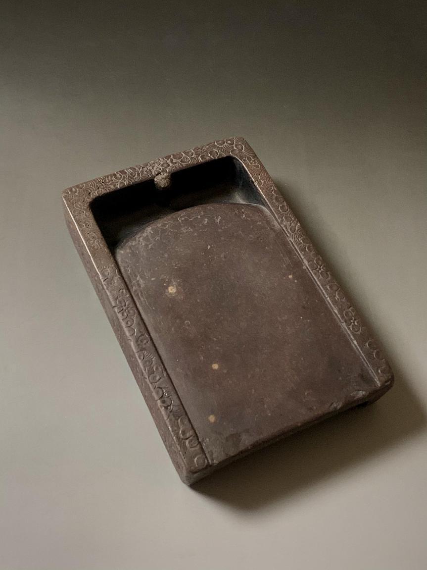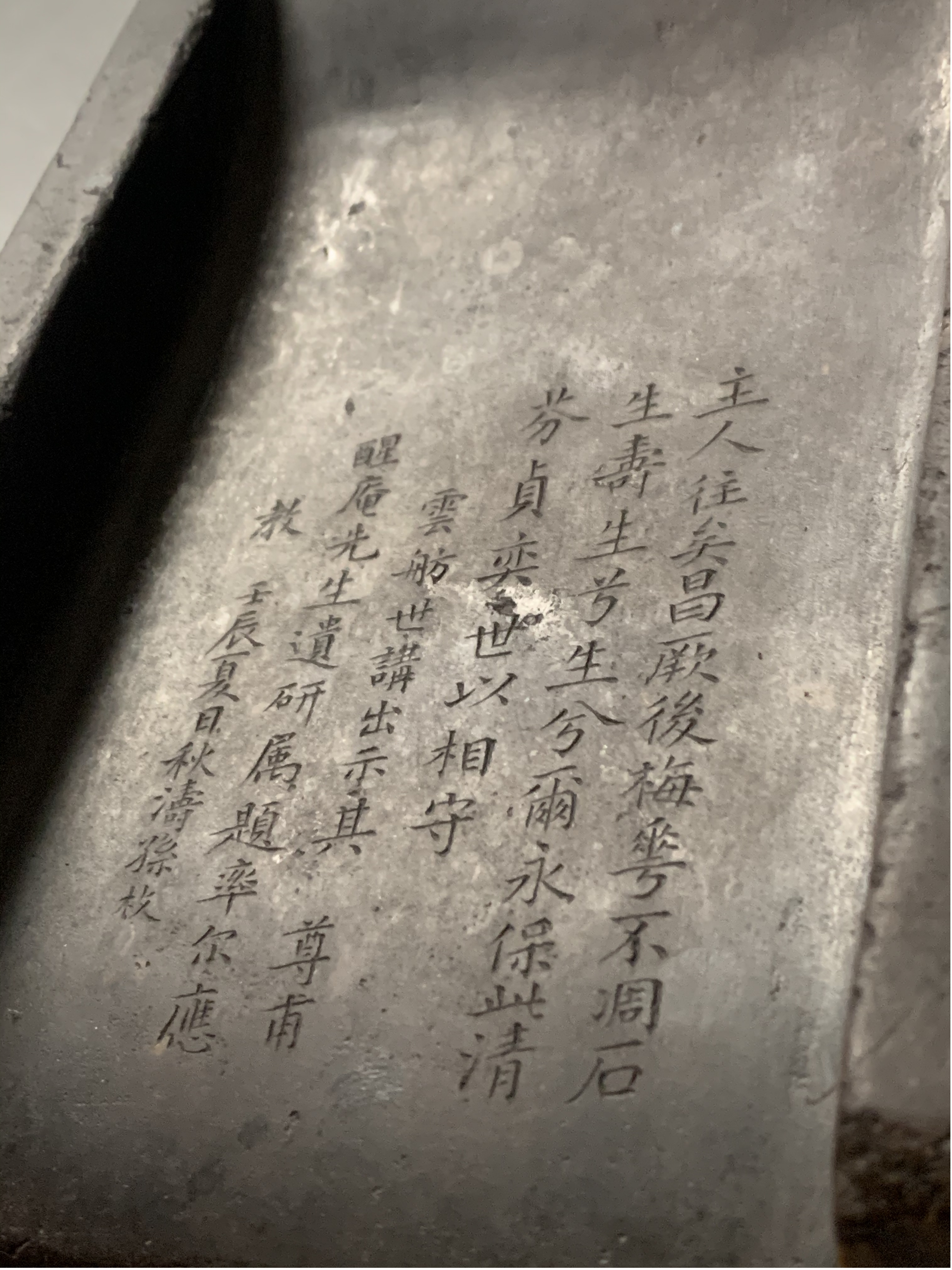 难得的是,该砚背有精致的铭文:“主人往矣昌厥后,梅花不凋石生寿,生兮生兮,尔永保此,清芬贞奕,世以相守。云舫世讲出示其尊甫醒庵先生遗研(砚),属题率尔应教,壬辰夏日秋涛孙枚。”从铭文内容可知,砚主人醒庵先生即明代大画家沈周的老师陈宽,云舫即陈宽之子,秋涛孙枚即是陈宽的学生。