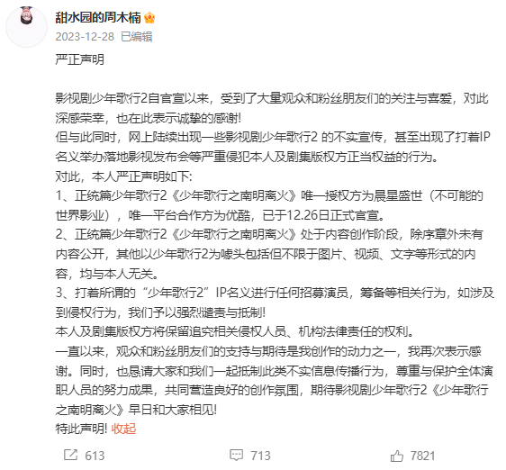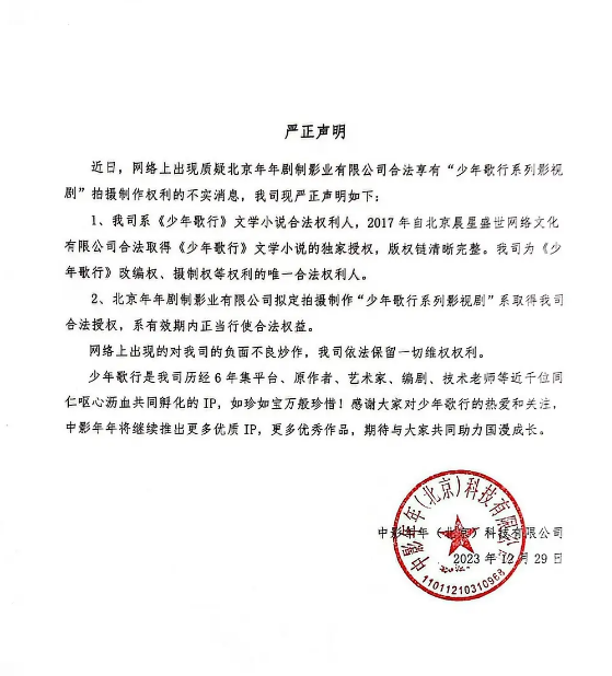 一石惊起千层浪,怎么有两个《少年歌行2》?怎么还有一个被作者打假了?到底谁在制作真正的《少年歌行2》?12月29日,年年剧制影业发布严正声明,称“拍摄制作《少年歌行》系列影视剧,系取得《少年歌行》小说权利人中影年年(北京)科技有限公司合法授权。”并公开相关的授权书。中影年年也发布严正声明,表示中影年年为《少年歌行》改编权、摄制权等权利的唯一合法权利人,系列影视剧为有效期内正当行使合法权益。