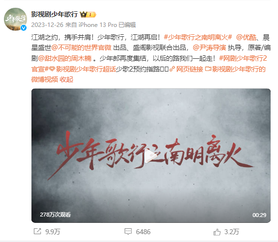 12月26日,优酷和周木楠通过微博共同官宣了少年歌行2的真人剧集,定名为《少年歌行之南明离火》。现在文字版小说周木楠还在创作当中,目前仅发布了《少年歌行之南明离火篇序章》。一个口碑非常不错的IP有续作了,书粉和剧粉都挺开心的。但12月27日,中影年年和年年剧制开了一个发布会,官宣了网剧《少年歌行2》和三部少年歌行IP的网络电影,并表示已经进入了筹备阶段。