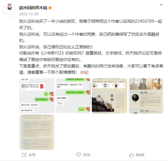 12月30日,周木楠回应:“我从没听说买了一本小说的版权,就等于顺带把这个作者以后写的一起买了的。”周木楠公开了自己从同行朋友那里收到的来自年年剧制的《少年歌行2》策划书。策划书中《少年歌行》此前的真人网剧、动画、小说都作为IP宣传的亮点,还给出了故事梗概。但实际上《少年歌行2》的小说周木楠只写了个序章,故事梗概无从说起。“我看完梗概惊掉了下巴,原来他们不是要没有授权拍《南明离火》,而是要自己编一个《少年歌行2》。我更加震惊,没想到还有这个操作!”周木楠将中影年年的《少年歌行2》定义为“自己写一个2,重新找一些演员,另外寻觅导演,纯纯的侵权山寨版。”