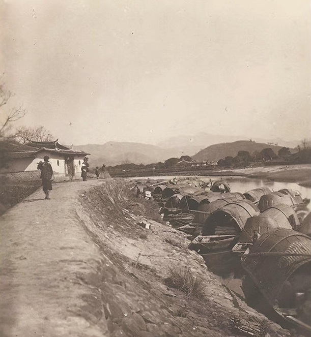 清末,停靠在五里街桃溪畔的溪舟船。(林联勇供图)