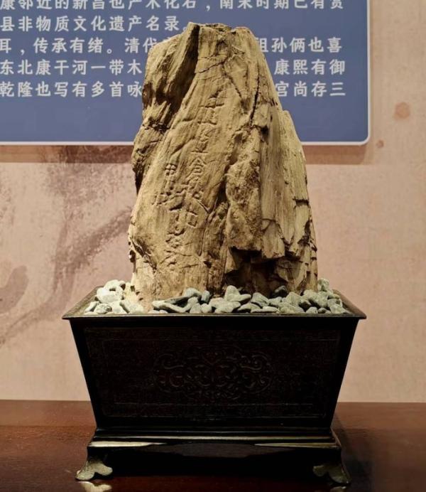 此次展出的一方永康松石“千古苍松化为石”(松石堂藏),发现于1992年,为一段松树干,树皮肌理清晰,遍身包浆老到,石上刻有楷书诗句及纪年款:“千古苍松化为石。甲戌”,类似有纪年刻款的松石极为少见。值得纪念的是,就在此次展览开幕之际,“永康松石赏石艺术”成功跻身于永康市非物质文化遗产名录。