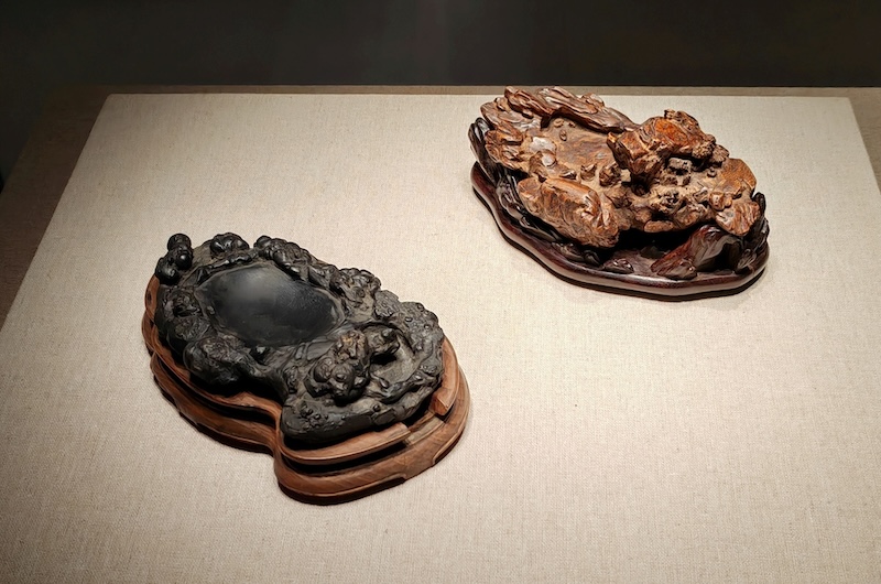 比如苏东坡十二岁时在老家的空地中发掘了“天石砚”(后来作有《天石砚铭(并叙)》),所谓天石砚,其实就是天然奇石砚,这也是苏东坡最早收藏的一方赏石。后来,天砚也成为了砚台的一种样式——也是现代赏石中的一种别裁,南宋髙似孙《砚笺》(卷一)在介绍砚图样式中,就收录了“天砚”。明代高濂《遵生八笺》还收录了一方“灵壁山石砚”图绘(元代“柯敬仲藏”款)。此次展览有一方“灵璧石天砚”(拨云轩藏),为自然造型灵璧石,四周为凸起黑珍珠纹,中间凿有砚池,与《遵生八笺》的“灵壁山石砚”如出一辙,可以说是一方入谱的赏石。