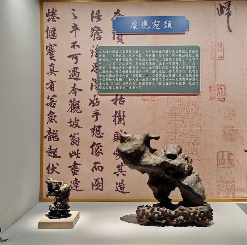 如果说,“论画以形似,见与儿童邻”是苏东坡对于“文人画”的宣言的话,那么,“石丑而文”好比是诗人对于传统赏石(“文人石”)的宣言。古人赏石重意味,不过也不排斥象形。比如,苏东坡画跋《书画壁易石》讲述他在灵璧刘氏园粉壁上作画的故事,他发现主人有一方灵璧石“作麋鹿宛颈状。东坡居士欲得之,乃画临华阁壁,作丑石风竹。主人喜,乃以遗予。”这方像麋鹿回首样子的灵璧石,最终由诗人高兴地带回了宜兴——时间在宋神宗元丰八年(1085)四月六日。这既是诗人以画易石的一则故事,也是灵璧石收藏文化史上的重要一页。此次展览,有一方灵璧石,体量较大,整个造型如同麋鹿回首,十分生动,极具张力,拨云轩主人将其命名为“麋鹿宛颈”,也是向坡翁致敬。