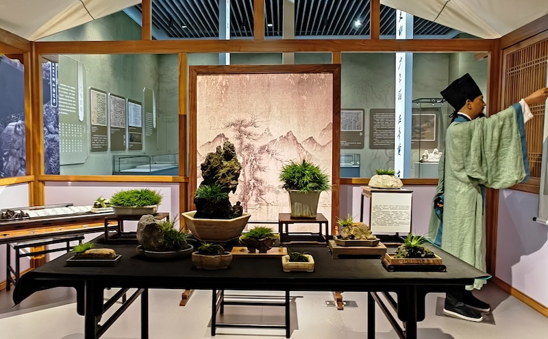 菖蒲,因其“不假日色,不资寸土”以及历冬不死寿百年的特性,向来被视为是“文人草”,至少在宋代已经在文人圈中流行莳养。苏东坡是附石植蒲的倡导者,他盛赞菖蒲“忍寒苦,安淡泊,与清泉白石为伍,不待泥土而生者”(《石菖蒲赞(并叙)》)喜欢以石植蒲,“斓斑碎玉养菖蒲,一勺清泉满石盂。”(《过文觉显公房》)。养蒲近些年成为盛事,走入了寻常百姓家,无锡王大濛先生是苏东坡附石植蒲的追随者,深入发掘古代名人养蒲事迹和经验,弄石刻铭制盆作画,别开生面,蔚为大观。此次展览,展示了王大濛先生一组植蒲,也是别有兴味。