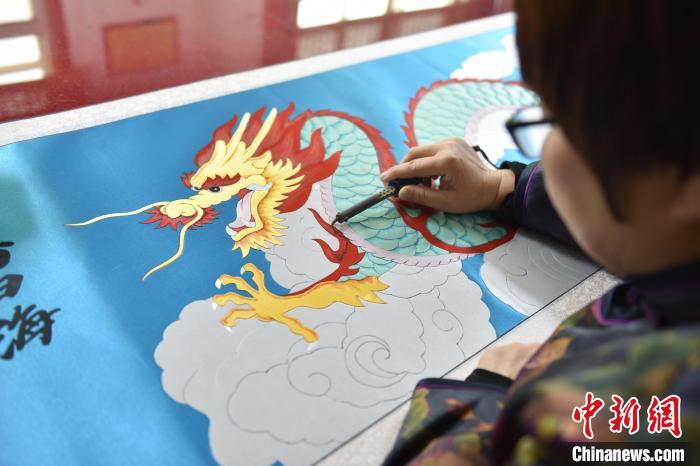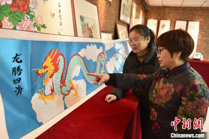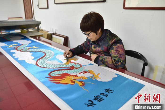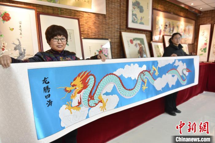 1月19日,河北省衡水市景县布雕画技艺传承人任雪青的工坊里,一幅长度超过3米的“龙”元素布雕画“龙腾四海”制作完成,作品色彩鲜明、栩栩如生,令人叹为观止。