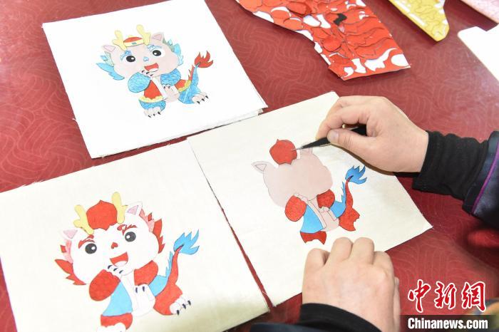 1月19日,任雪青正在创作“龙”元素布雕画。高雷摄