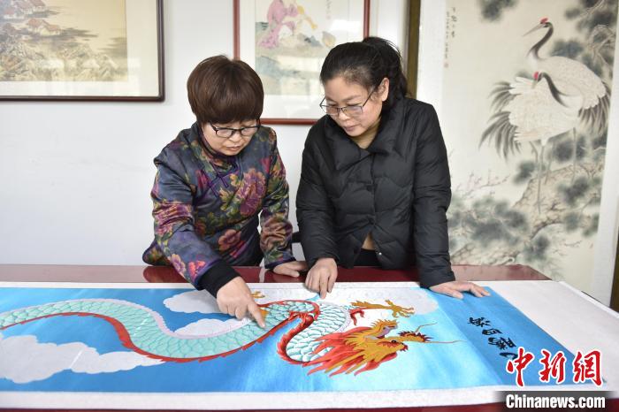 1月19日,任雪青(左)和徒弟展示“龙腾四海”布雕画。高雷摄