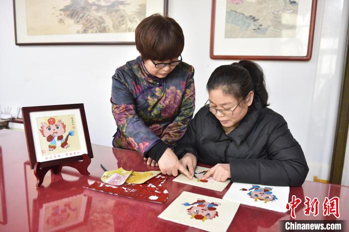 1月19日,任雪青(左)指导徒弟创作“龙”元素布雕画。高雷摄