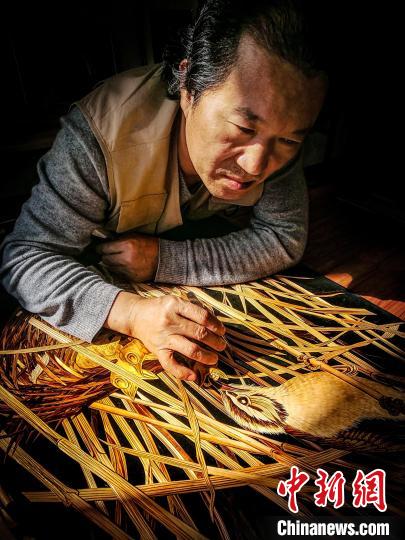图为杨丙军正在制作芦苇画(资料图)。李辉摄