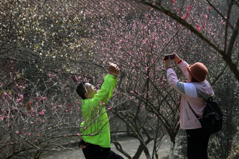 游客在梅关古道拍摄梅花。新华社记者黄国保摄