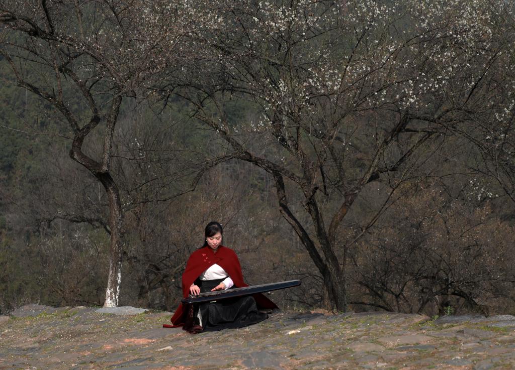 游客在梅关古道梅花下弹琴。新华社记者黄国保摄