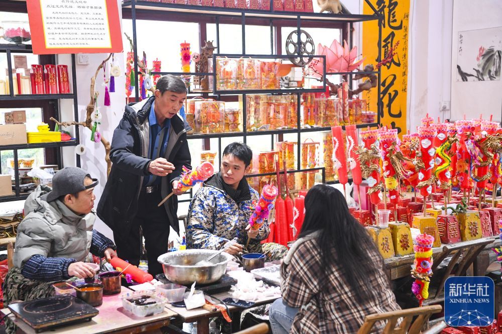 ↑1月25日,陈建友(左二)和工作坊成员交流龙凤花烛制作技巧。