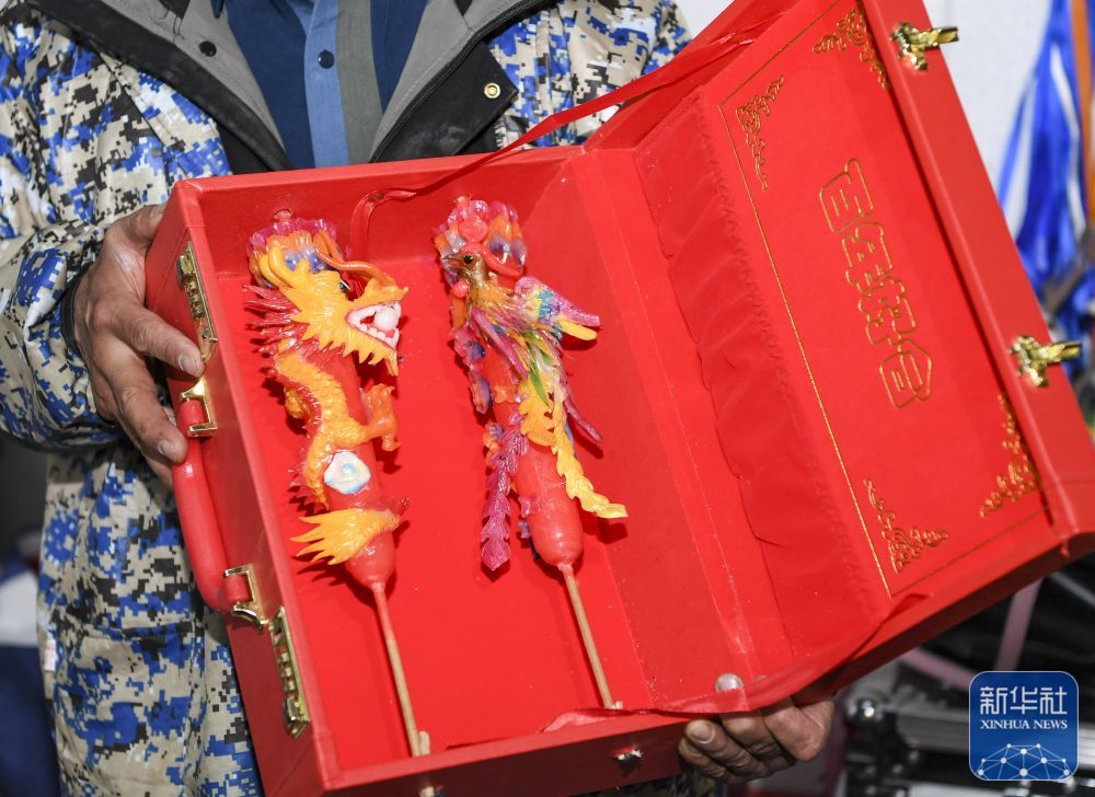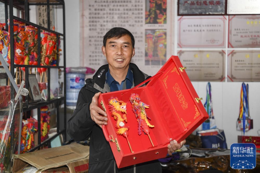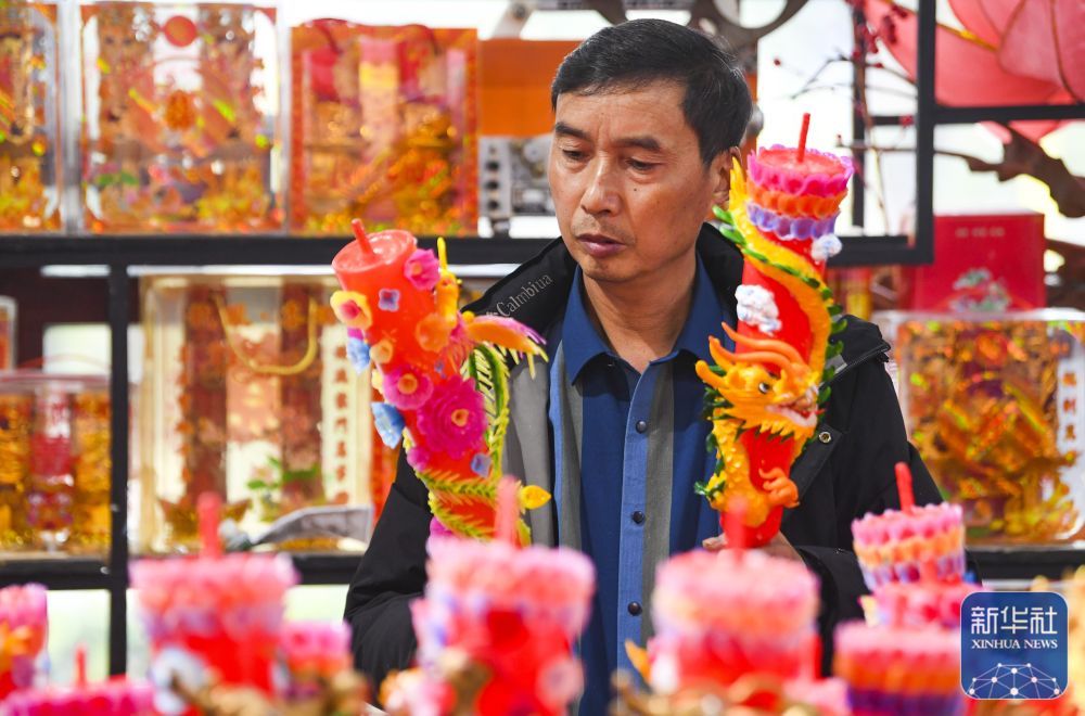 ↑1月24日,陈建友在工作坊展示龙凤花烛产品。