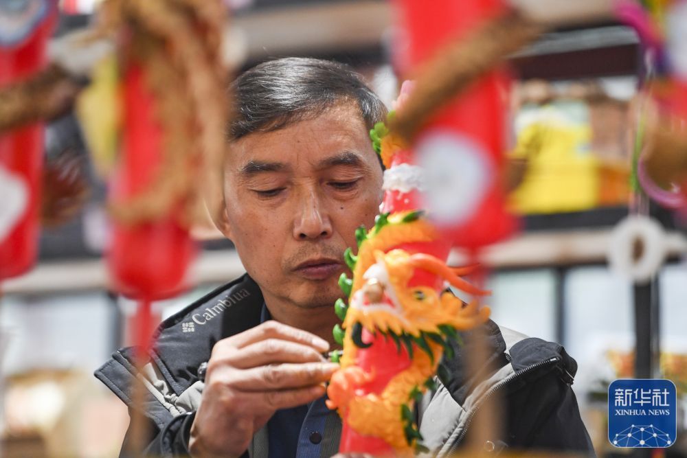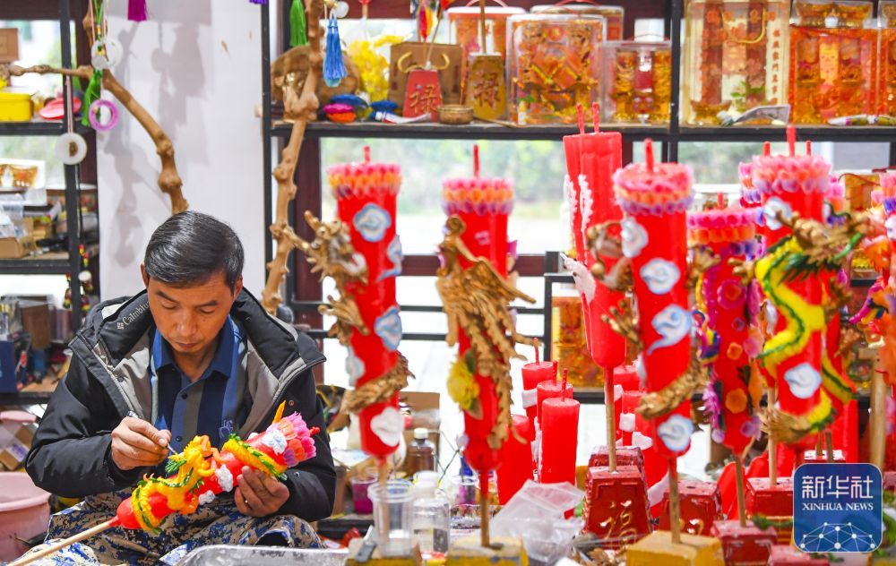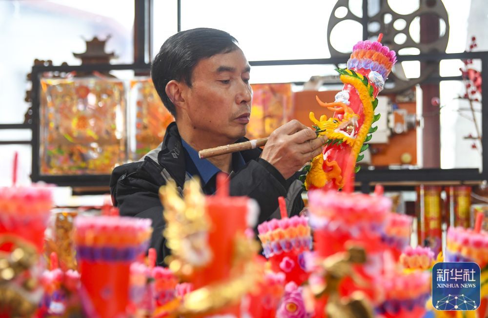 ↑1月25日,陈建友在工作坊制作龙凤花烛产品。