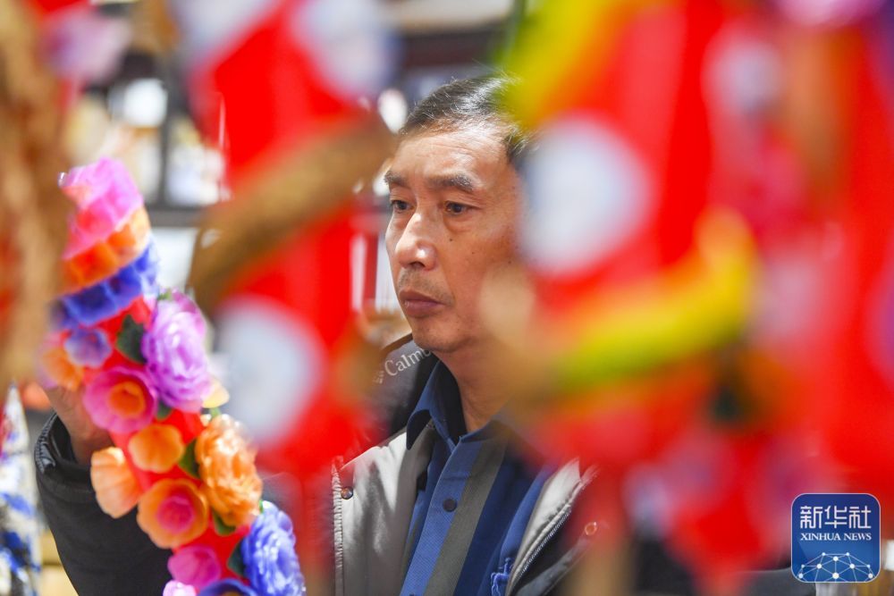 ↑1月25日,陈建友在工作坊查看龙凤花烛产品。