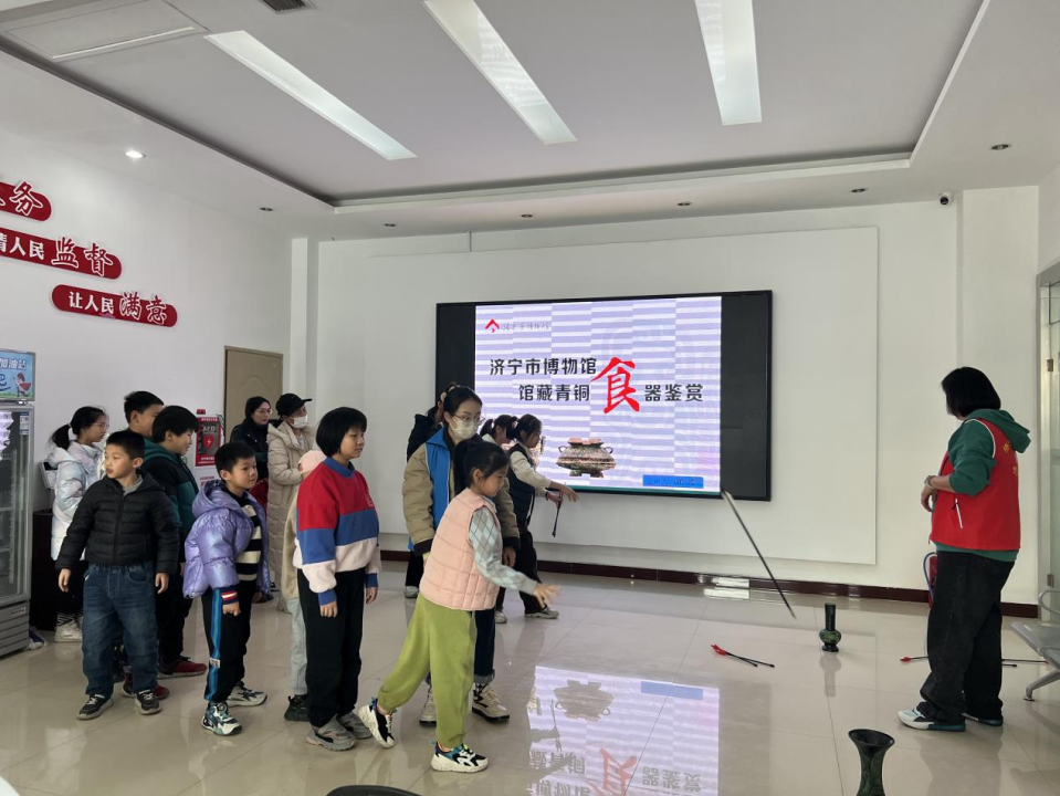课堂通过文字音像资料和体验教学等方式与居民们互动交流,传授了古代饮食文化、饮食礼仪,让社区居民们在娱乐中了解了济宁名字的由来、历史的变迁以及馆藏精品文物,宣讲员通过讲述博物馆里常见的精美青铜食器,了解青铜食器不仅是贵族进行宴飨、祭祀等礼制活动的重要礼器。“大家看看这个是什么字?‘甗’,这个字的意思是蒸锅,下面是装水的,上面放要蒸的食物。簋上面是兽面纹,也叫饕餮,是龙的第五个儿子,它很贪吃哦,经常出现在青铜器上。”宣讲员生动地讲道,这也是人们日常的饮食用具。宣讲员也表示“行走的博物馆”打破以往完全靠场地教育的模式,使辖区近距离了解历史文化,成为传统文化在社区传播的一道美丽的风景线。宣讲结束后,社区网格员协助现场的居民还体验了投壶活动。