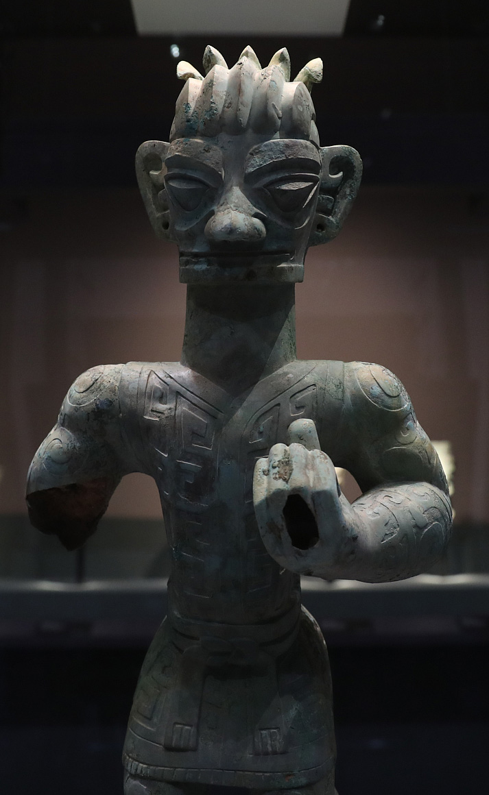 “竖披发青铜人像”是三星堆遗址博物馆最受欢迎的展品之一,它有着矫健的身姿、健硕的肌肉和微微后翘的臀部。中国古代雕塑的传统不注重写实,尤其是人物形象。但学者认为商代晚期长江流域的青铜艺术是偏写实的艺术风格,长江流域三星堆遗址出土的这种写实的青铜人物造型,可以更新我们对于中国古代艺术的认知。