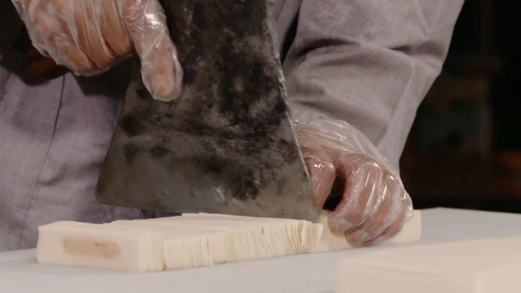 云片糕虽然看起来朴实无华,但要做到犹如凝脂,轻薄透亮、口感细糯滑绵,入口即化,其实并不简单,用料考究,工序复杂,包括“选主料—洁河沙—备糕粉—陈化—熬糖—调粉—制作糕坯—切片—包装”9大工序。