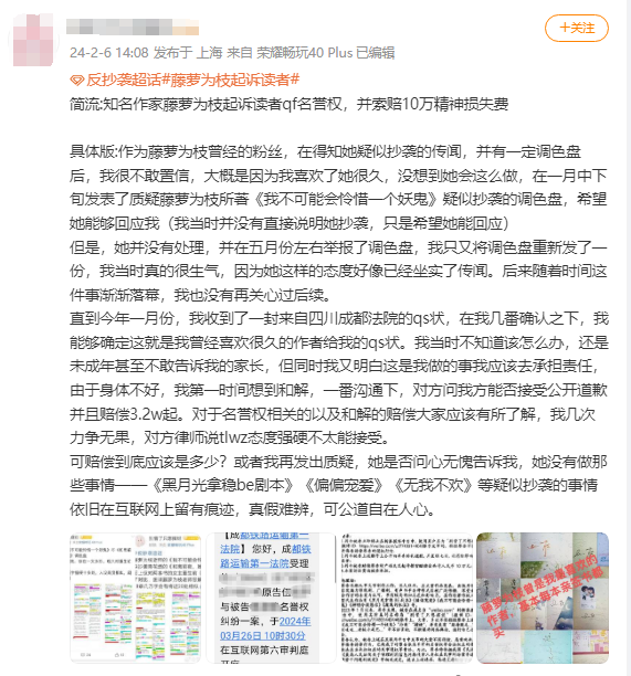 该读者称,自己曾为藤萝为枝的一名忠实读者粉丝,购入了不少藤萝为枝出版小说的亲笔签名本,在听说了藤萝为枝疑似有抄袭的传闻并有调色盘(调色盘是指将疑似抄袭文与原文进行比对的表格,是网上用于界定对比两者是否存在抄袭嫌疑的非专业手段,主要目的在于让其他人看出二者的相似和不同)后自己感到不敢置信。一月下旬自己发表了质疑藤萝为枝的《我不可能会怜惜一个妖鬼》疑似抄袭的调色盘,希望她能够有所回应。但是五月份左右藤萝为枝举报了调色盘,于是网友再次发布了调色盘并表示非常生气,但随着时间推移网友也没有再关注这件事的后续。一月时,网友收到了来自四川成都法院的起诉状,发现自己被藤萝为枝起诉了,起诉状中写道,原告发现被告在微博大量、多次不实指控原告作品《我不可能会怜惜一个妖鬼》“抄袭”“撞梗”并发表有“期待腿毛……”“四川吱吱……老板小尾巴”等不法言论,煽动网络舆论,原告诉讼请求被告赔偿原告财产损失及精神损失赔偿金共计10万元。