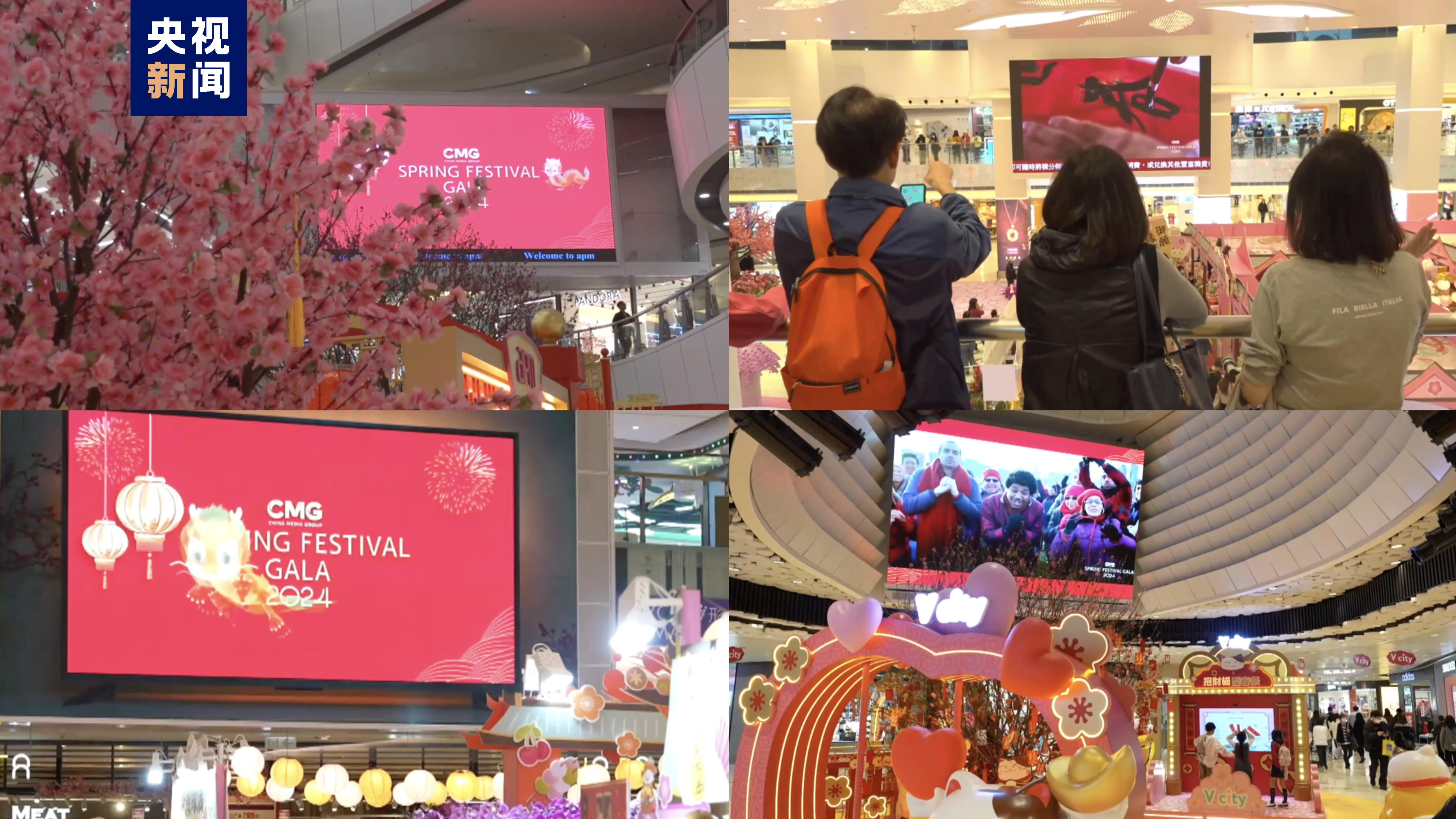△香港13家商场的大型屏幕循环播放着总台春晚宣传片