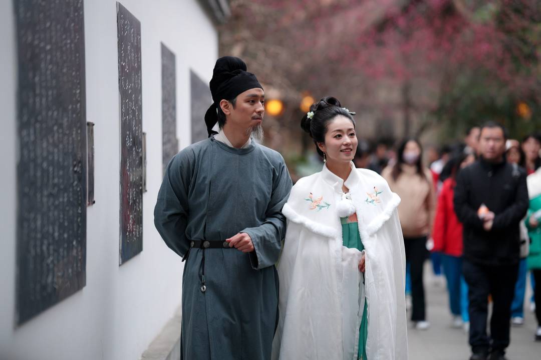 赏梅、祈福、观展、吟诗、祭诗圣……现场,据成都杜甫草堂博物馆讲解员唐黛玉介绍,今年的诗圣文化节以“诗传千古情,花重锦官城”为主题,通过展览、诗会、演出、非遗体验等系列文化活动突出诗歌内核。