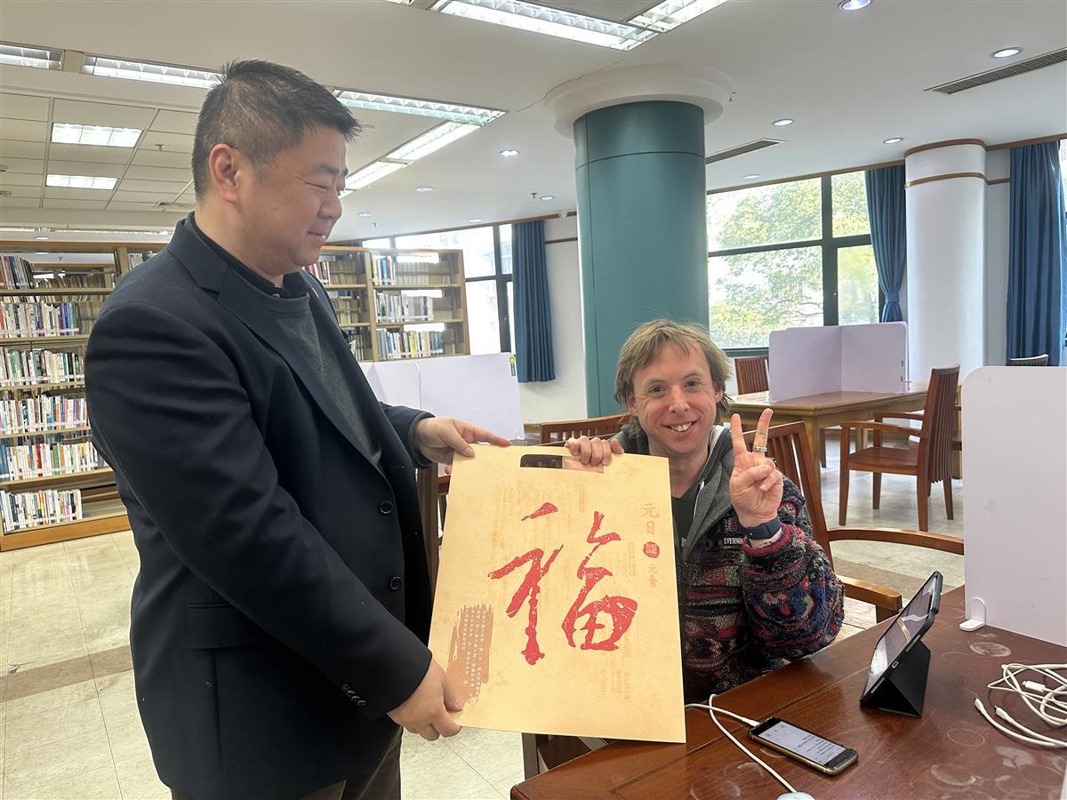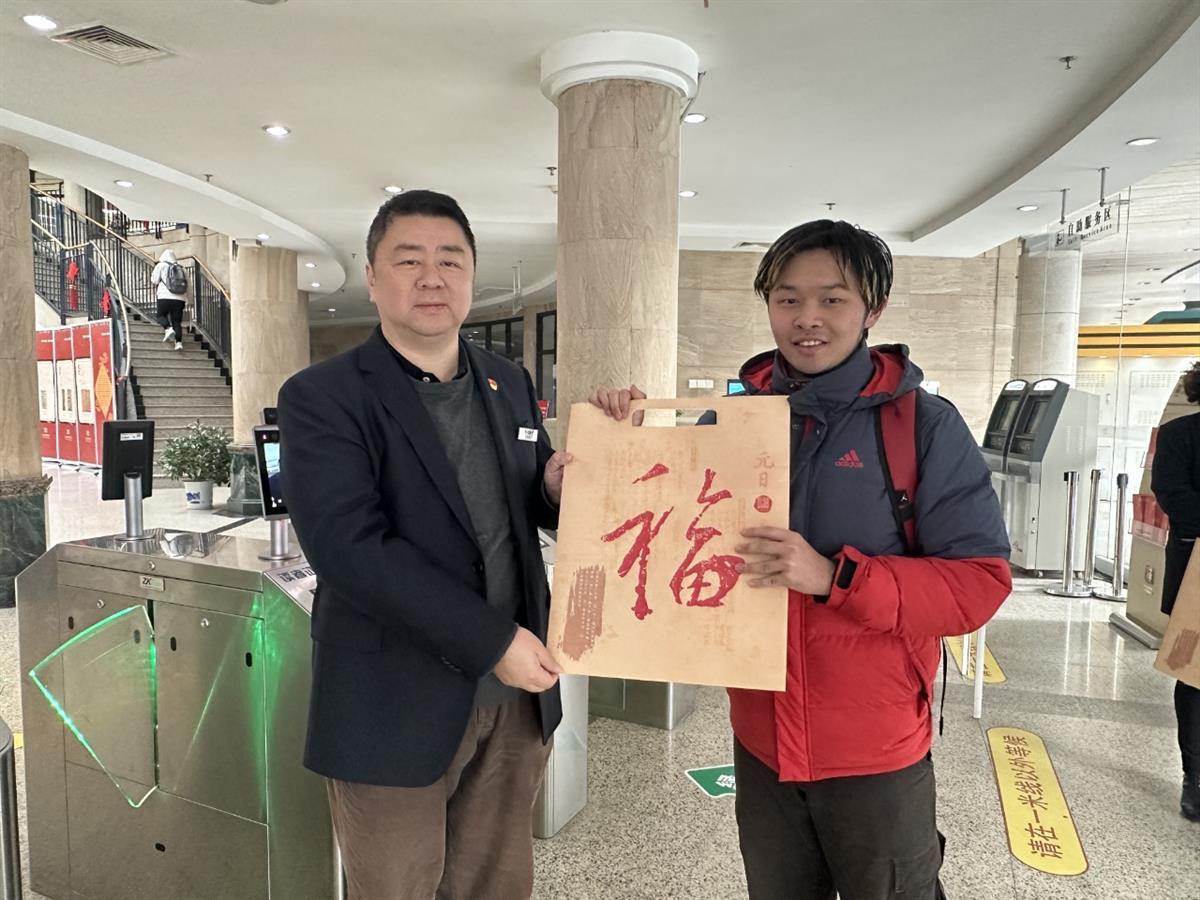 馆长(左)为当日到馆的一名外国读者也送去了“甲辰龙年福袋”