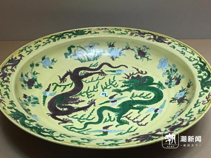 黄地素三彩花卉云龙纹折沿盘(清·康熙)