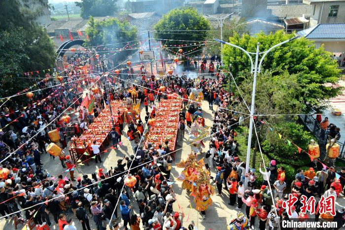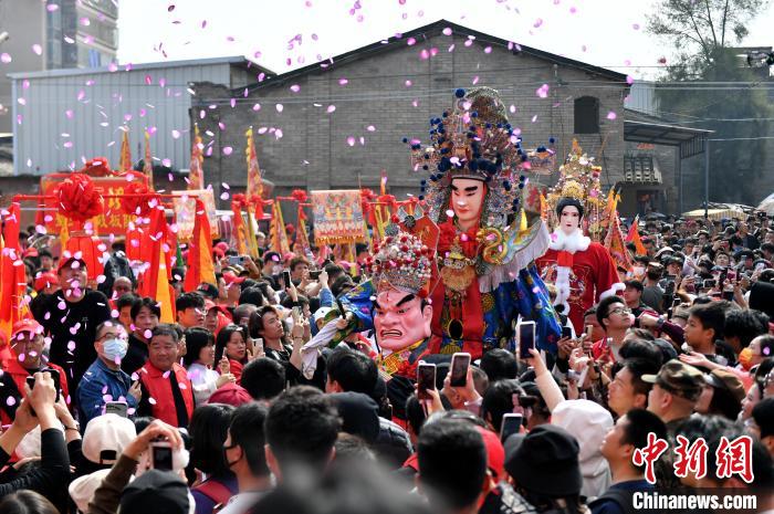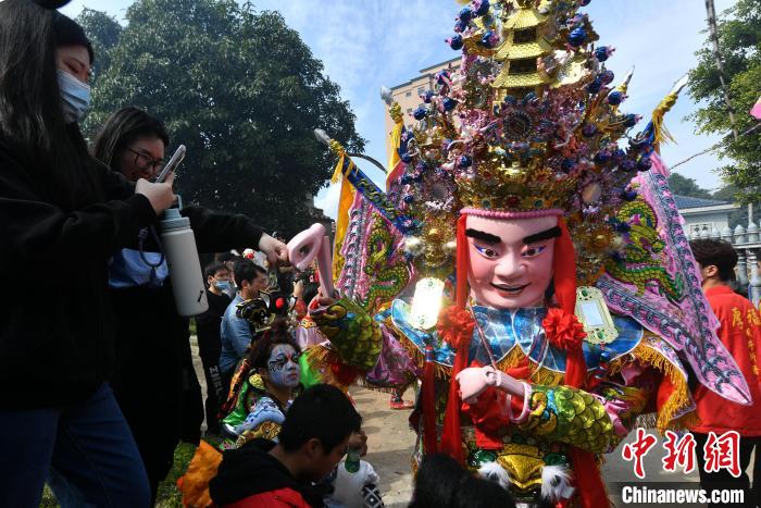 中新网福州2月19日电 (叶秋云)“咚咚咚……”19日上午,一阵阵锣鼓声从侨乡福建省福州市长乐区潭头镇厚福村传出,一场传统游神民俗活动在此举行,来自海内外的游客纷纷举起手机和相机拍照留影。