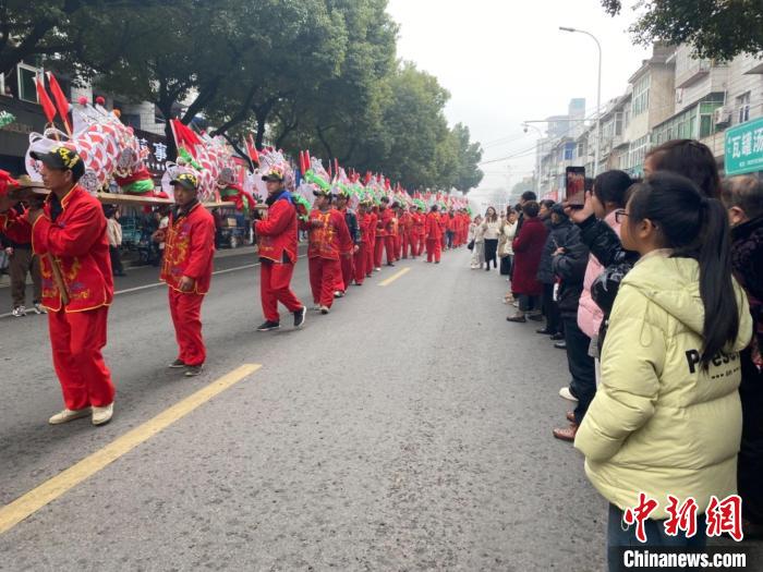 展演中的南陵板龙灯,共108节,总长度超过220米。舞动时,一人擎一板,伸屈自如。吴兰摄。