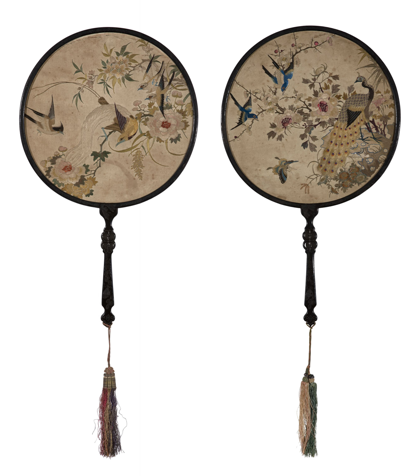 清同治·白色双面缎绣百鸟争春图漆柄宫扇。 肖为 摄