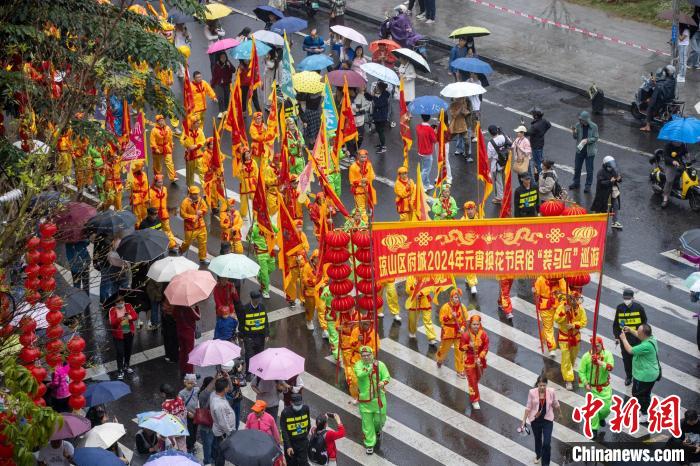 2月24日,海口市琼山区府城举行“装马匹”民俗祈福巡游。 中新网 记者骆云飞 摄