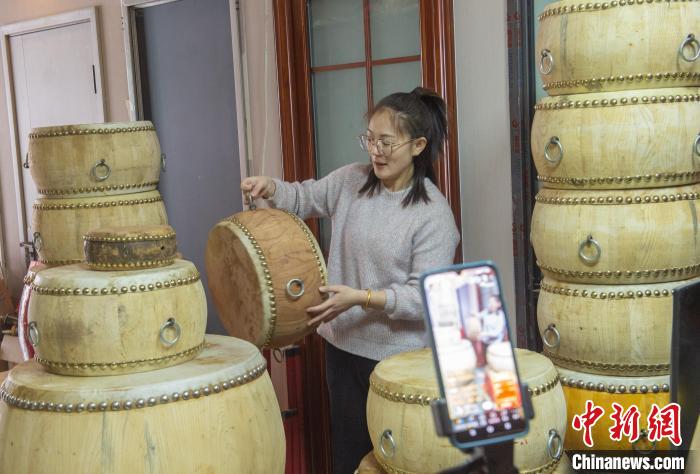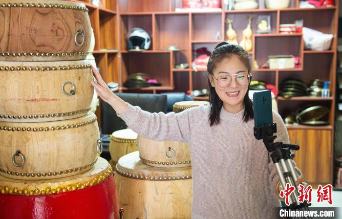 2月27日,付记制鼓的一名主播正在直播带货。李金刚摄