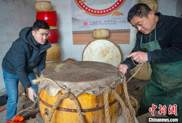 2月27日,付俊魁(右)和助手正在拴绳蒙鼓皮。李金刚摄